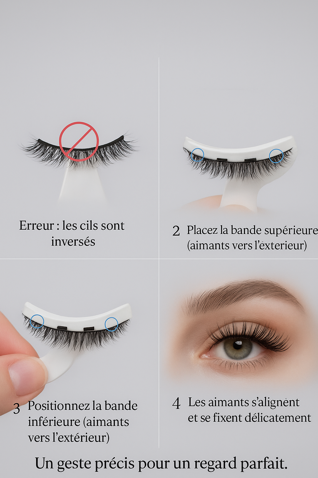 Placez délicatement la frange magnétique sur vos cils naturels, les aimants se fixent automatiquement. Vous pouvez ajuster légèrement pour un positionnement parfait.